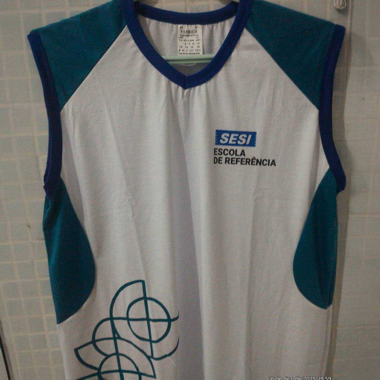 • Recortes: Frente e costas em azul turquesa (0126), conferindo um design moderno e alinhado ao padrão escolar.